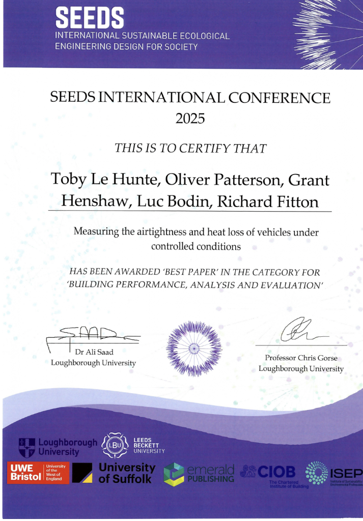 Energy House Labs is delighted to share that our colleague Toby Le Hunte led a paper which received an award at this year’s International Sustainable Ecological Engineering Design for Society (SEEDS) 2025 Conference.